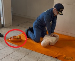 《後半にやったAED訓練。赤丸のところにAEDが》